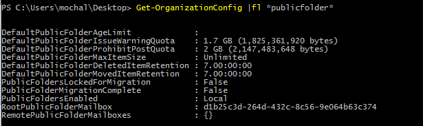 If you receiving warnings about quota when using public folder, then you need to change organisation wide settings. For this example we have had DefaultPublicFolderIssueWarningQuota set to 1.7GB and DefaultPublicFolderProhibitPostQuota set to 2GB.